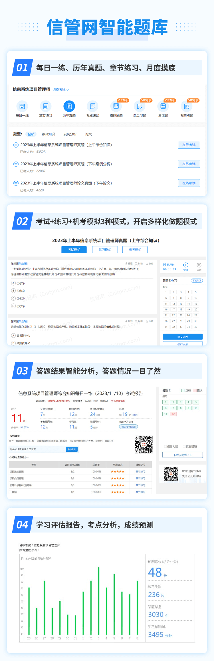 信管網(wǎng)為信息化考試與服務(wù)專(zhuān)業(yè)平臺(tái),目前開(kāi)設(shè)有信息系統(tǒng)項(xiàng)目管理師、系統(tǒng)規(guī)劃與管理師、系統(tǒng)集成項(xiàng)目管理工程師、信息安全工程師考試與學(xué)習(xí)服務(wù)。提供了包括考試報(bào)名、考試課程、成績(jī)查詢(xún)、真題發(fā)布、資料下載、案例分析、論文、考試教程、在線題庫(kù)、每日一練、章節(jié)練習(xí)、信管人才、論壇交流等服務(wù)。我們將為廣大信管考友提供專(zhuān)業(yè)、及時(shí)、全面、貼心的考試服務(wù),立足于為廣大信管考友建造一個(gè)優(yōu)質(zhì)的學(xué)習(xí)平臺(tái),讓考生都能夠享受學(xué)習(xí),順利通關(guān)。