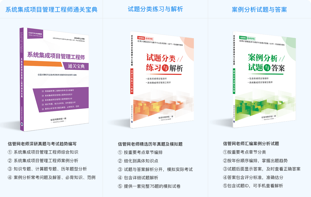 除了官方教材外,這里也推薦下信管網(wǎng)《系統(tǒng)集成項(xiàng)目管理工程師輔導(dǎo)資料》,該資料由信管網(wǎng)資深講師們結(jié)合官方教材、大綱及歷年出題情況和命題趨勢(shì)組織編寫(xiě),供培訓(xùn)學(xué)員內(nèi)部使用,不單獨(dú)出售。